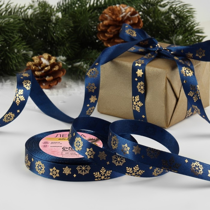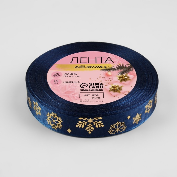 Новый год! Лента атласная с тиснением «Фигурные снежинки», 15 мм, 23 ± 1 м, цвет синий/золотой №038