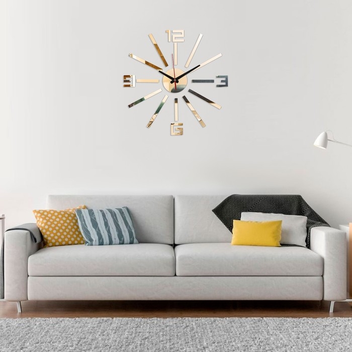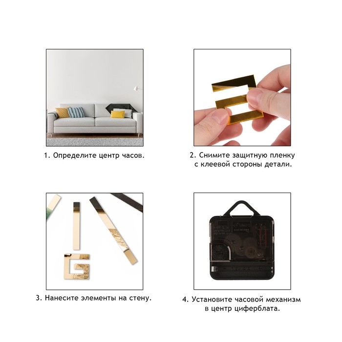 Создавайте часы в собственном стиле, проявляйте изобретательность и креативность. Не обязательно располагать числа по кругу — придайте аксессуару необычную форму, поменяйте диаметр циферблата, используйте не все элементы. Комплектующие легко клеятся на стену и без труда снимаются.
