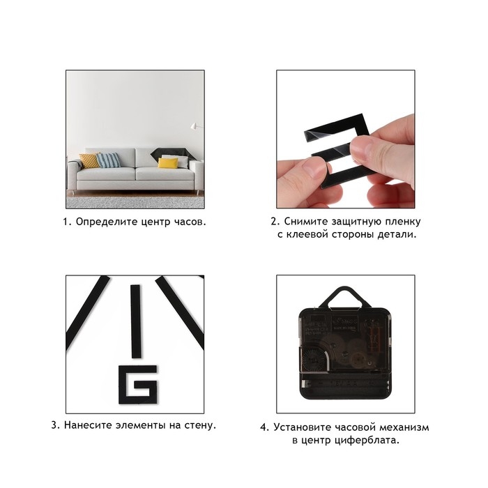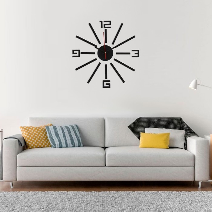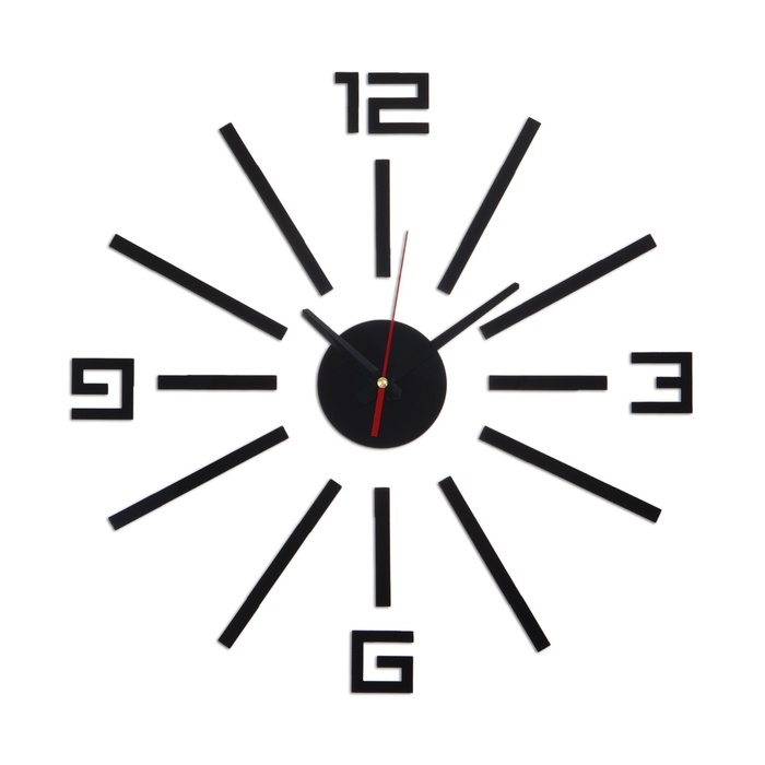 Создавайте часы в собственном стиле, проявляйте изобретательность и креативность. Не обязательно располагать числа по кругу — придайте аксессуару необычную форму, поменяйте диаметр циферблата, используйте не все элементы. Комплектующие легко клеятся на стену и без труда снимаются.