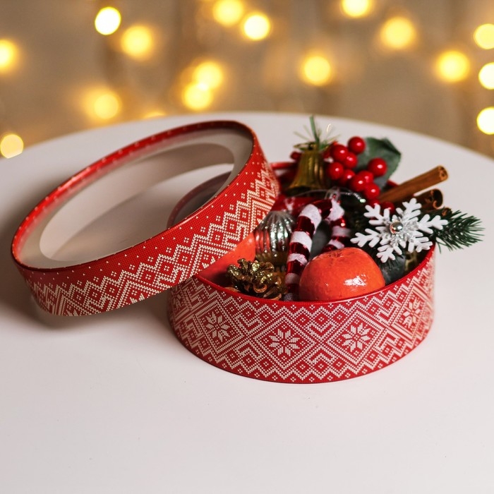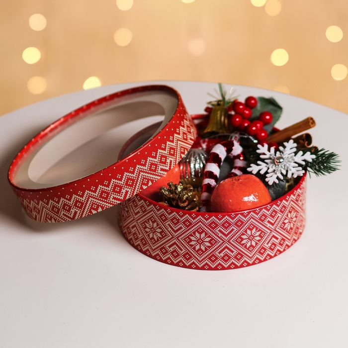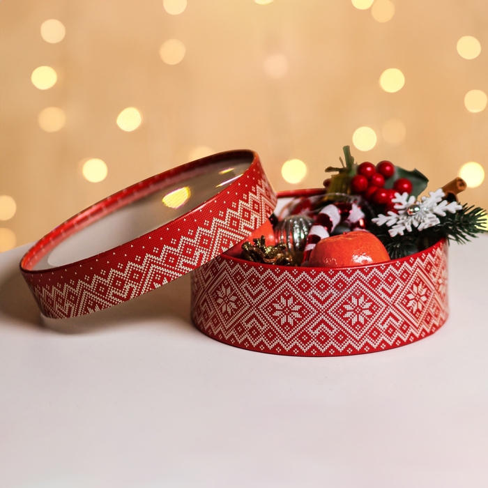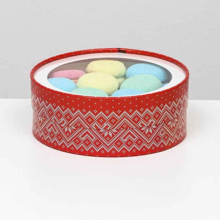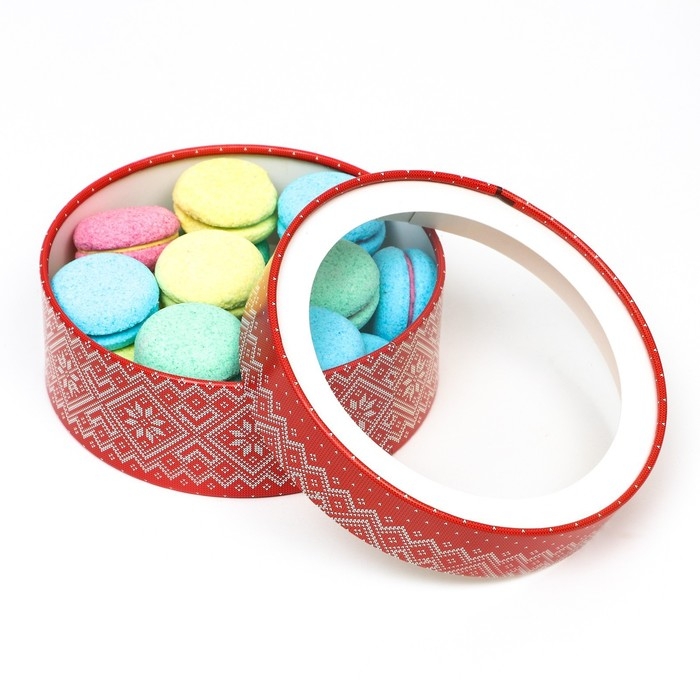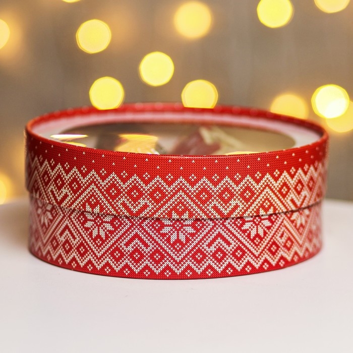 Новый год. Коробка подарочная новогодняя для макарун тубус с окном "Узор" 18 х 18 х 6 см.