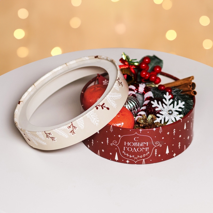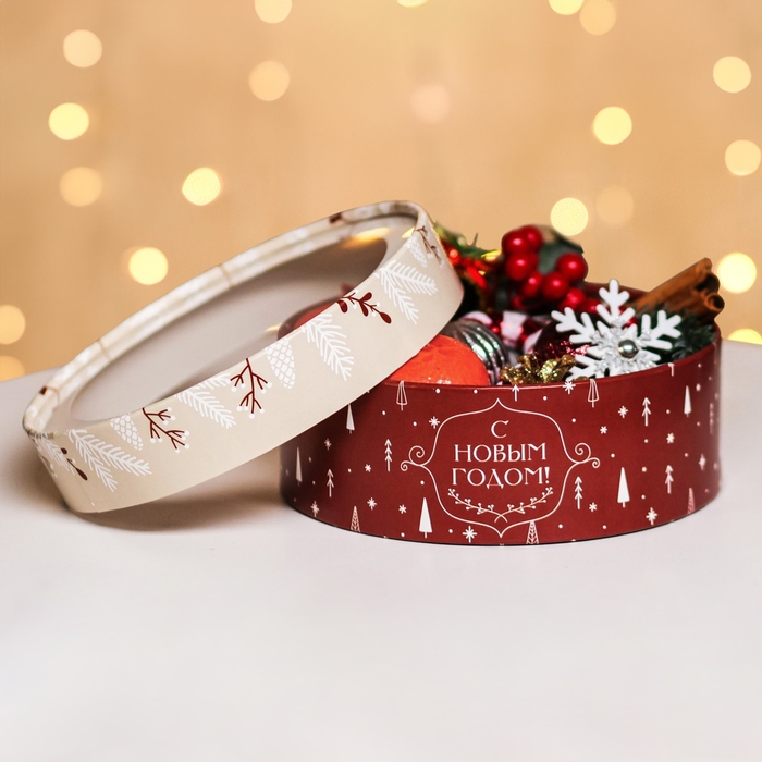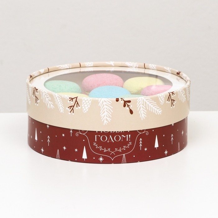 Новый год. Коробка подарочная новогодняя для макарун тубус с окном "Новогодний подарок" 21 х 21 х 8 см.