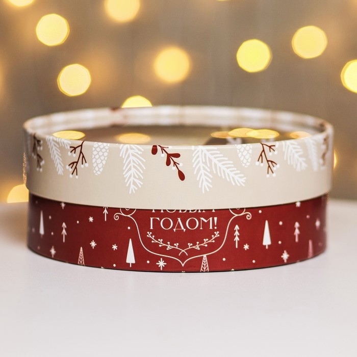 Новый год. Коробка подарочная новогодняя для макарун тубус с окном "Хоровод ёлочек" 18 х 18 х 6 см.