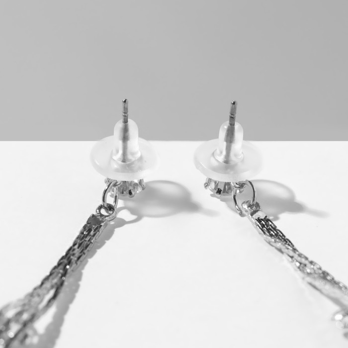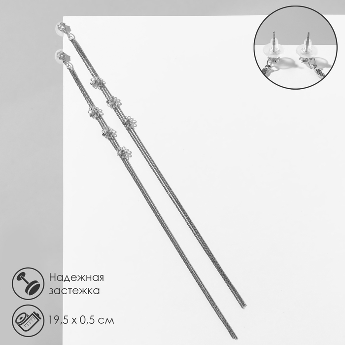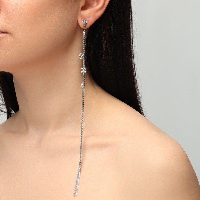 Серьги висячие со стразами «Голливуд» цветы на нитях, цвет белый в серебре, 19,5 см