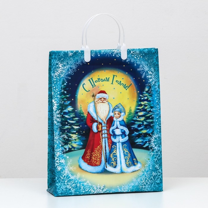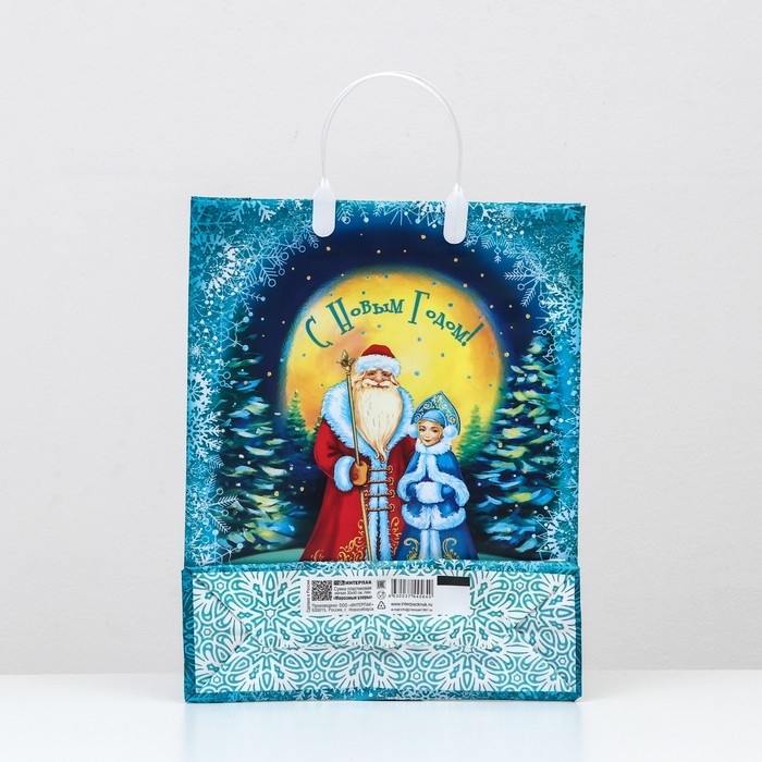 Новогодний подарочный пакет с ярким, красочным рисунком создаст праздничное настроение.