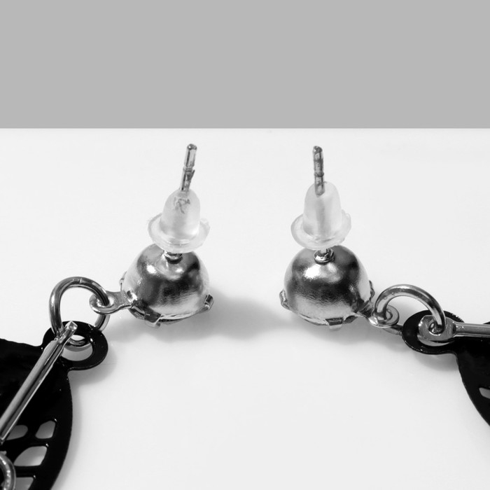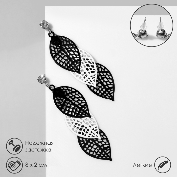 Серьги висячие «Листья» трио, цвет чёрно-белый в серебре, 8 см