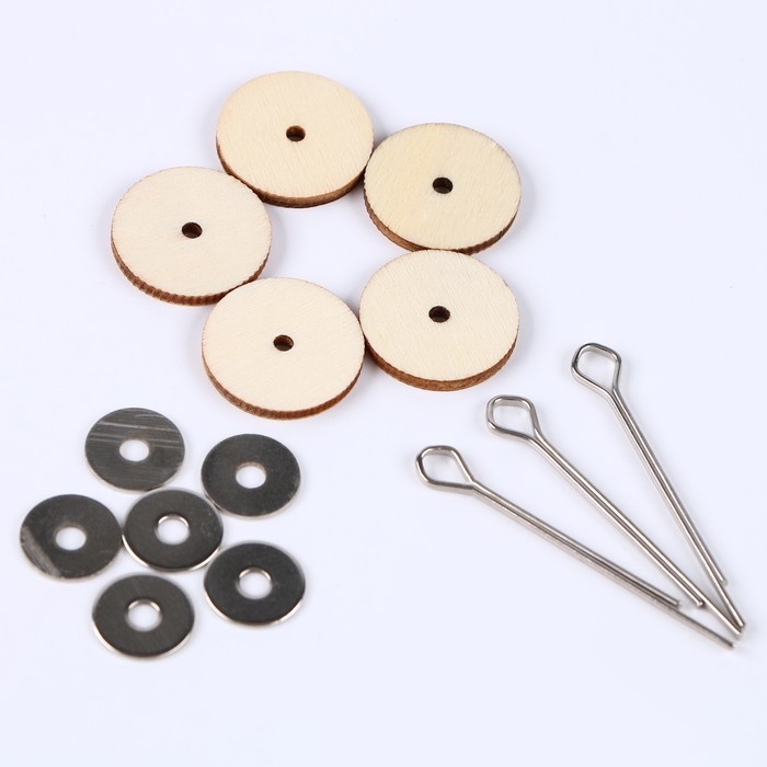 Для крепления одного сустава вам понадобится 2 шплинта, 2 металлических шайбы и 2 деревянных диска.