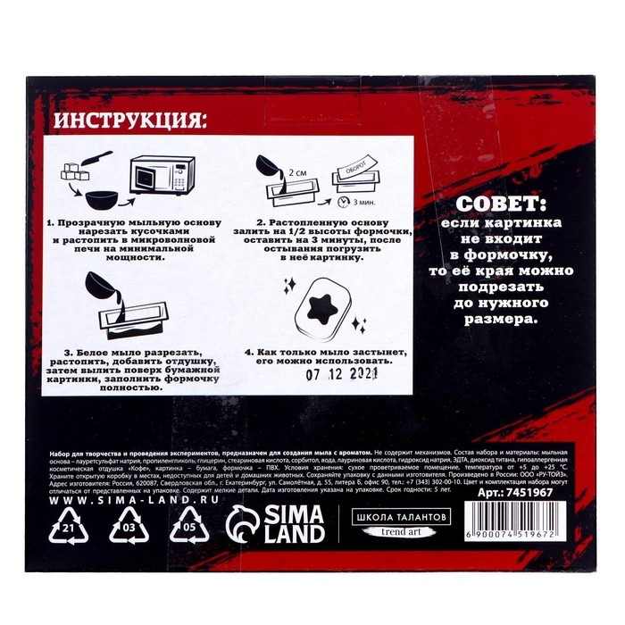 С помощью этого набора вы сможете создать ароматное мыло с яркой картинкой в домашних условиях. Самое главное, что результат своих трудов можно использовать каждый день.