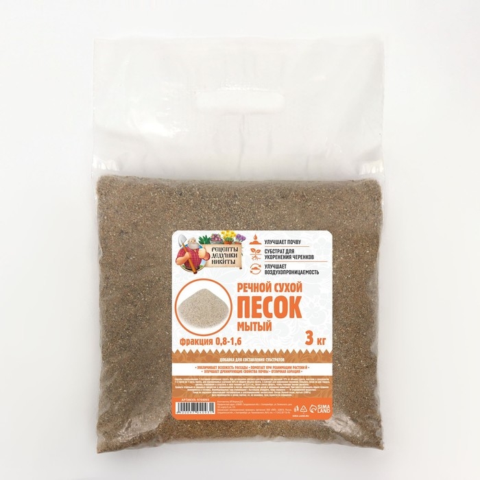 Речной песок "Рецепты дедушки Никиты", сухой, фр 0,8-1,6, 3 кг
