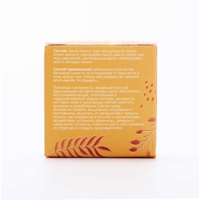 Состав: масло кокоса, воск миндальный, масло семян граната, сафлоровое масло, масло семян чиа, мед кавказский, прополисное масло, облепиховое масло, экстракт манго.