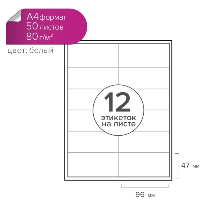 Этикетки А4 самоклеящиеся 50 листов, 80 г/м, на листе 12 этикеток, размер: 96 х 47 мм, матовые, белые