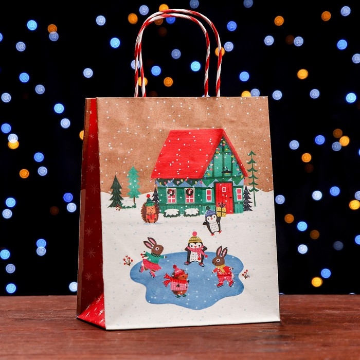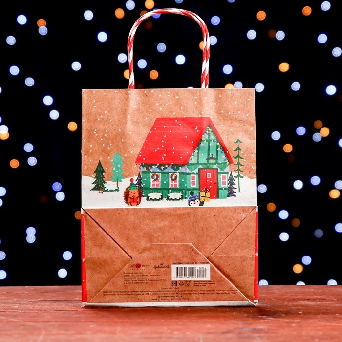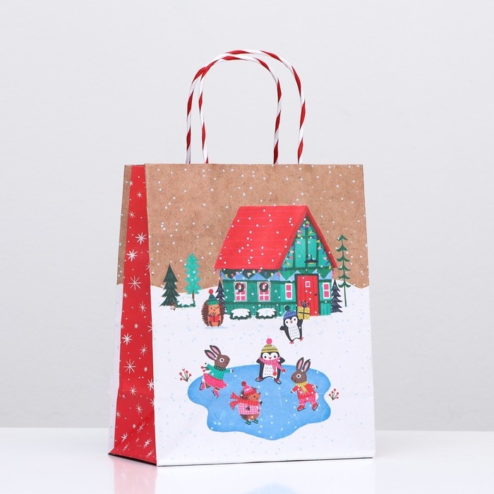 Новый год. Пакет бумажный подарочный новогодний крафт "Новогодний двор" 18 х 22,3 х 10 см.
