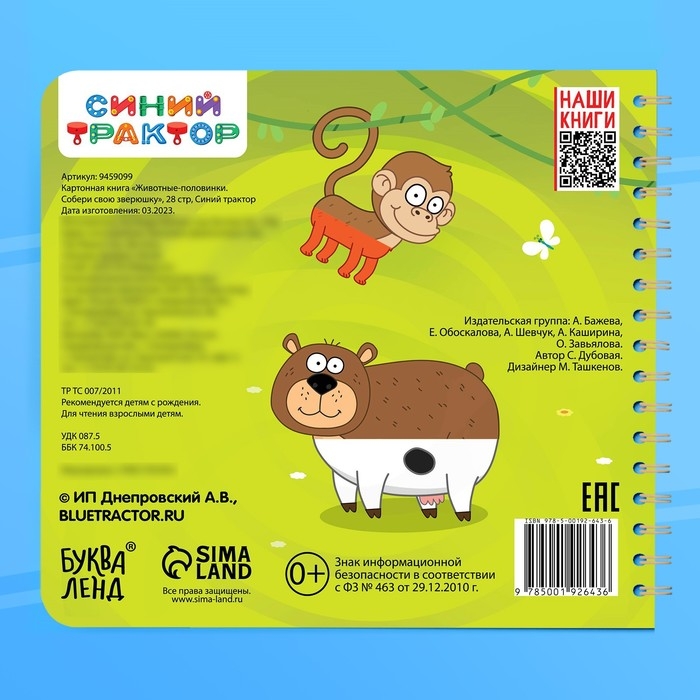 Картонная книга со стихами «Найди пару. Собери свою зверюшку», 28 стр., Синий трактор