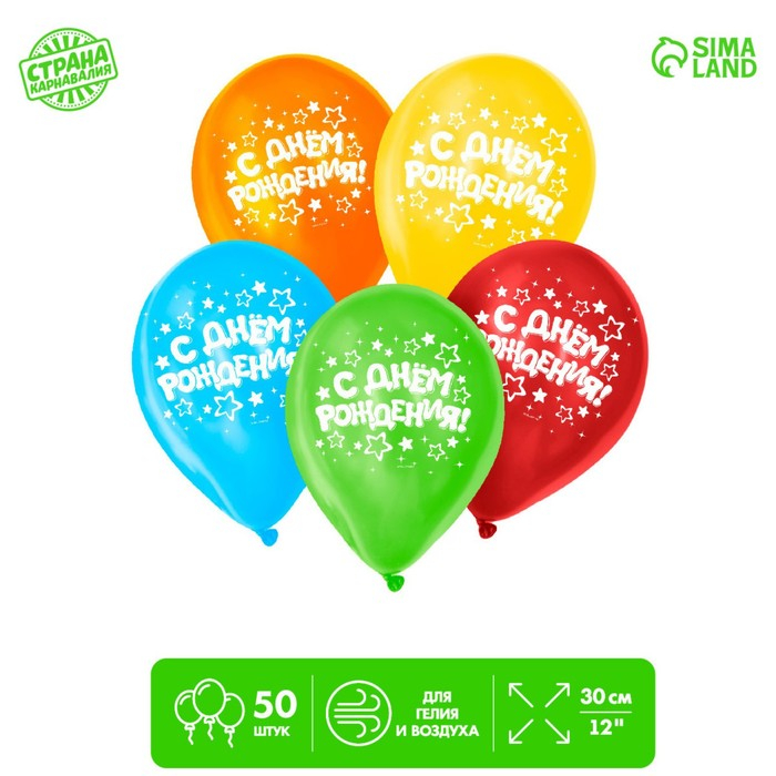 Воздушный шар латексный 12" «С днём рождения», звёзды, 50 шт.
