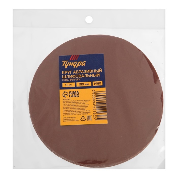 Круг абразивный шлифовальный под "липучку" ТУНДРА, 150 мм, Р180, 5 шт.