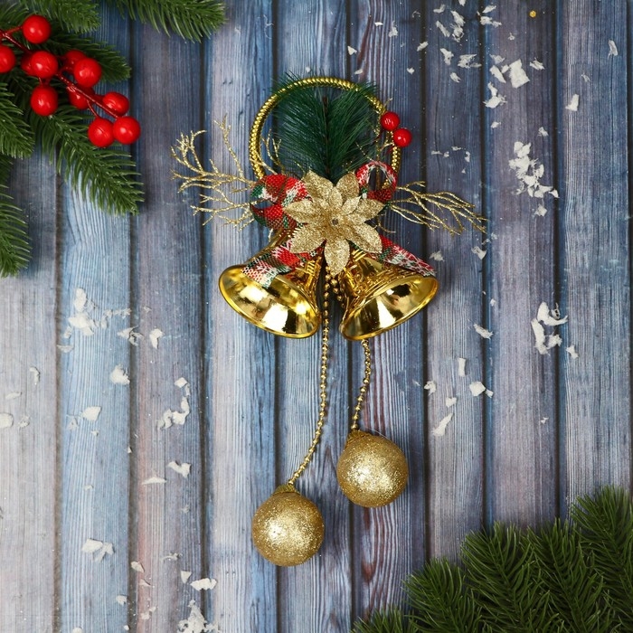 Украшение новогоднее "Колокольчики с цветком и веточками" 10х25 см, золото