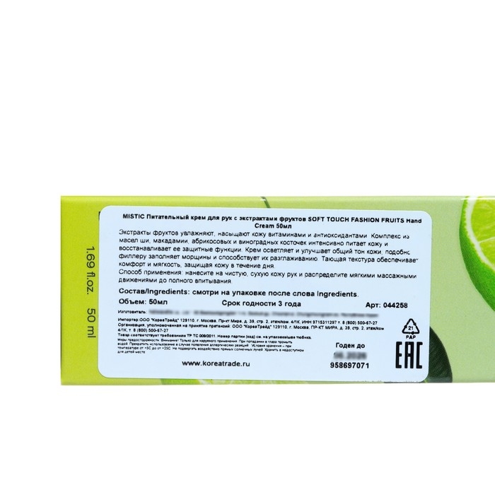 Питательный крем для рук MISTIC с экстрактами фруктов, 50 мл