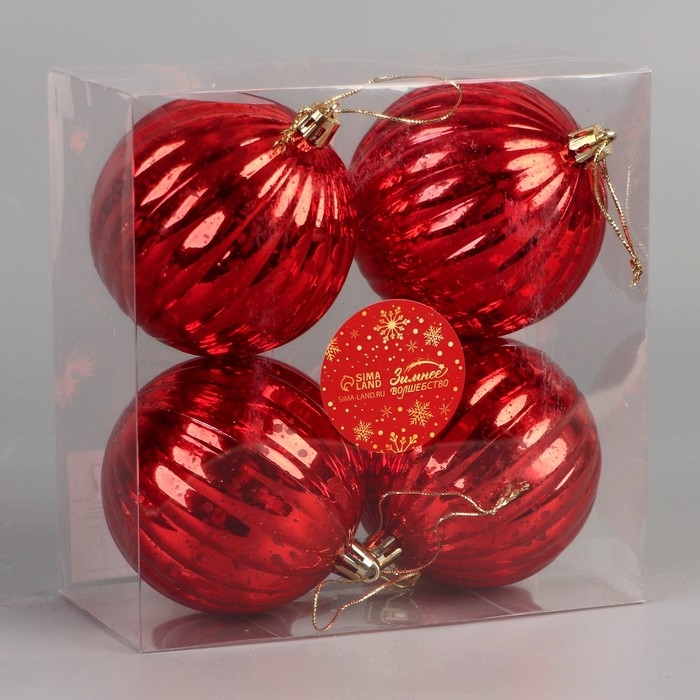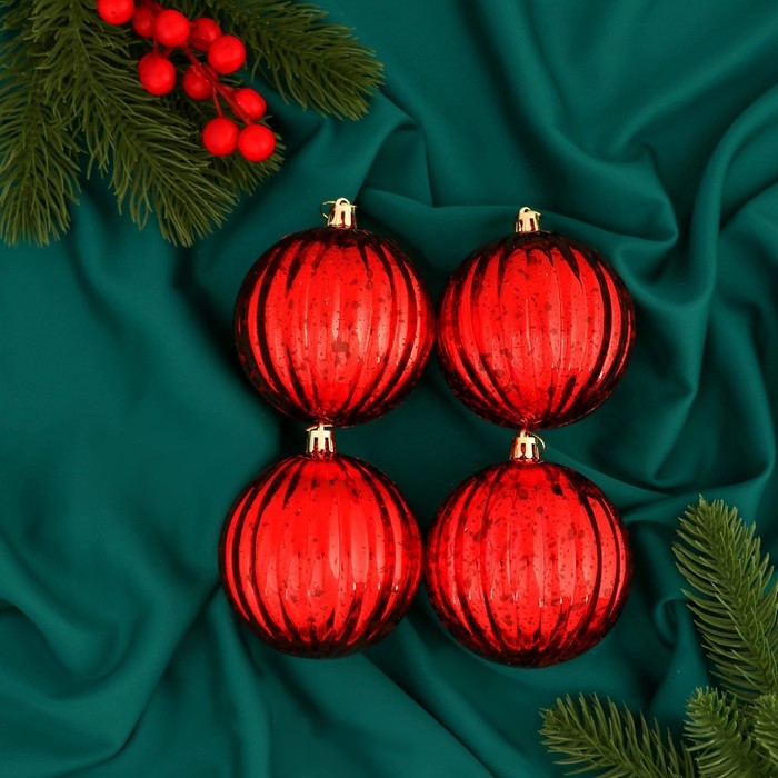 Набор шаров пластик d-8 см, 4 шт "Винтаж" полосы, красный