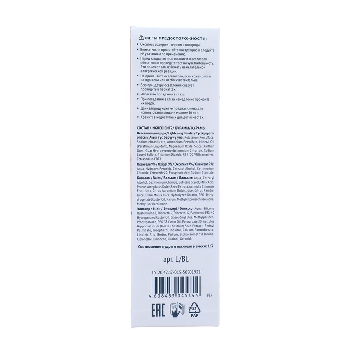 Оcветление до 5 тонов. Увлажняющие и ухаживающие компоненты растительного происхождения защищают волосы в процессе осветления. Эликсир Love создаёт на поверхности волоса плёнку, способствующую выравниванию структуры волос. Бальзам с фруктовым комплексом восстанавливает структуру и эластичность волос, делая их мягкими и блестящими.