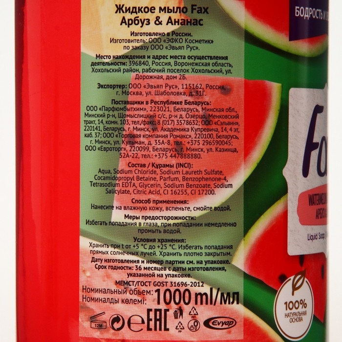 Fax жидкое мыло арбуз и ананас 1000 мл. Проверенное качество и многолетний опыт мирового лидера и доступная цена делают продукцию выбором номер один для ежедневной заботы и чистоты всей семьи. Встречайте новинки от Fax! Новое жидкое мыло с фруктовыми ароматами и ярким привлекательным дизайном обладает увлажняющими и питательными свойствами и имеет 100% натуральную растительную основу!