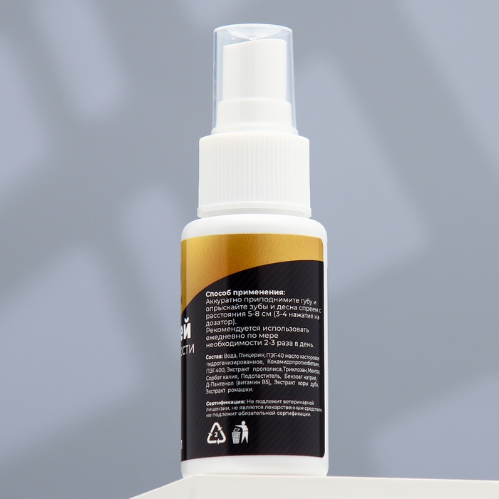 СПОСОБ ПРИМЕНЕНИЯ: Аккуратно приподнять губу и опрыскать зубы и десна с расстояния 5-8 см (3-4 нажатия на дозатор). Рекомендуется применять ежедневно по мере необходимости 2-3 раза в день.
