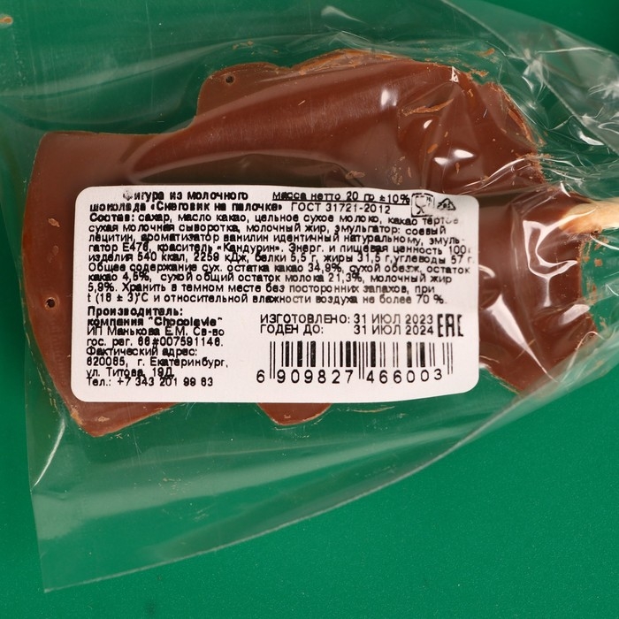 Фигура из молочного шоколада "Снеговик" на палочке - это не просто сладость, это настоящий волшебный подарок, который принесет радость и удовольствие в самые долгожданные моменты праздничного сезона.