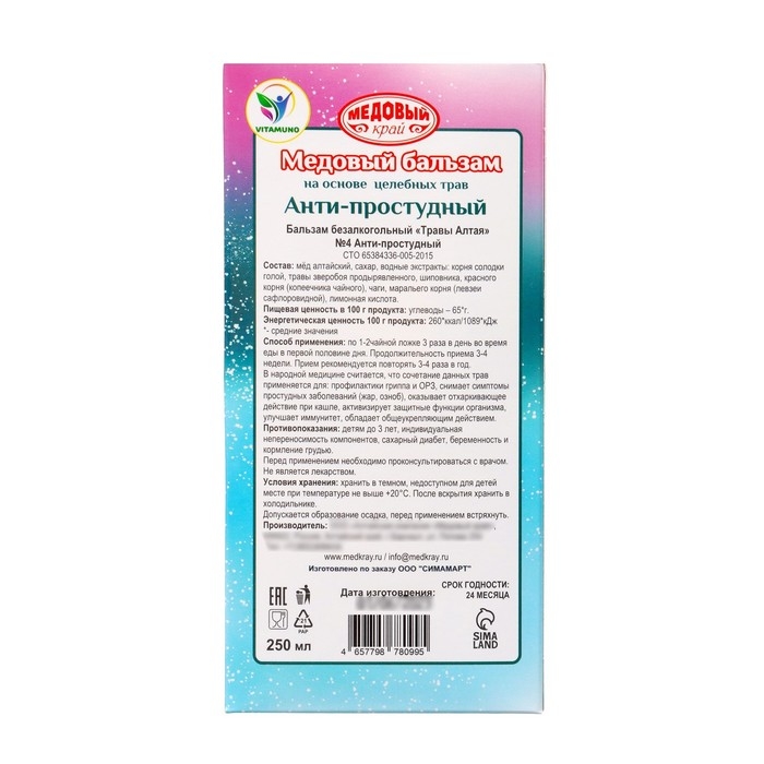 Новый год. Новогодний медовый бальзам алтайский "Анти-простудный", 250 мл