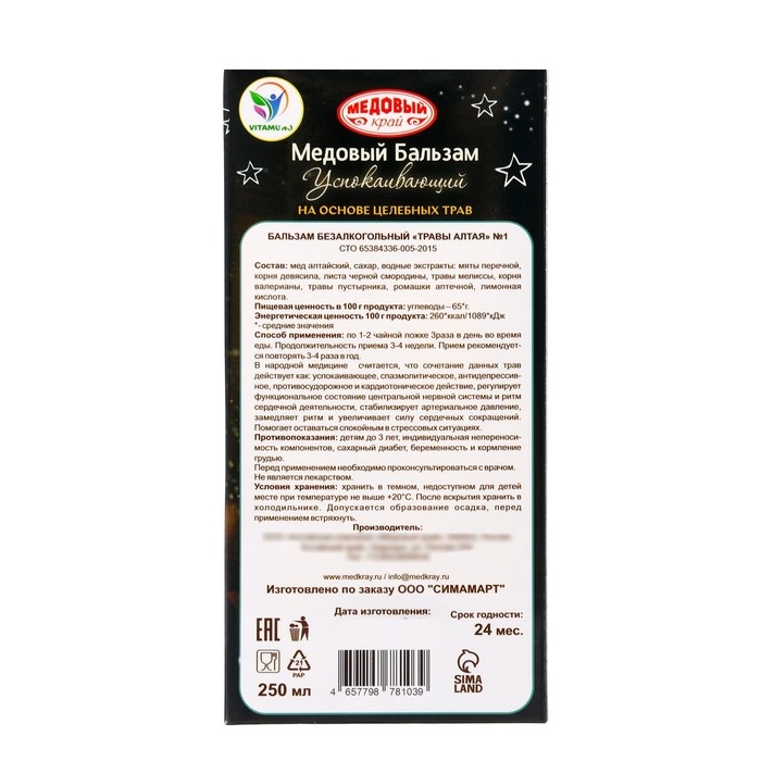 В составе бальзама: натуральный Алтайский мед — мята перечная — девясил — лист черной смородины — мелисса — валериана — пустырник — ромашка. В народной медицине считается, что сочетание данных трав действует как: успокаивающее, спазмолитическое, антидепрессивное, противосудорожное действие.