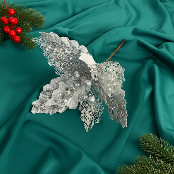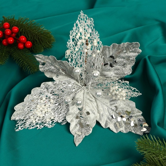 Декор "Зимний цветок" сеточка бусинки, 24х15 см, серебро