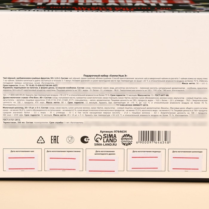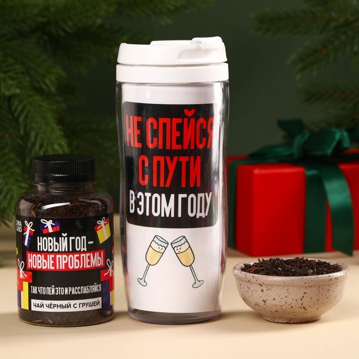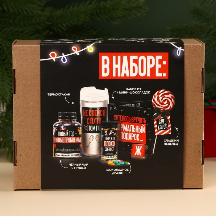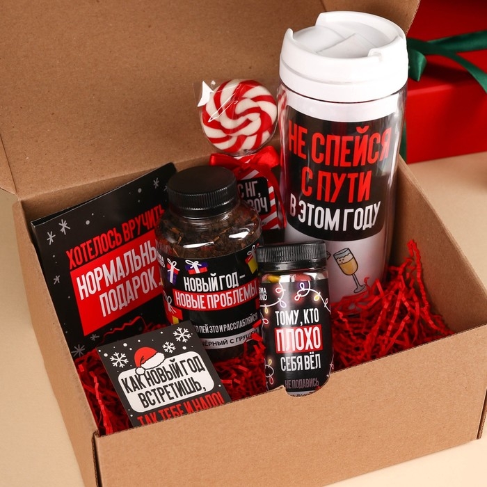 Гифтбокс «Хэпи Нью Э»: термостакан, чай чёрный с фруктами, леденец со вкусом клубники, драже, молочный шоколад, 4 шт