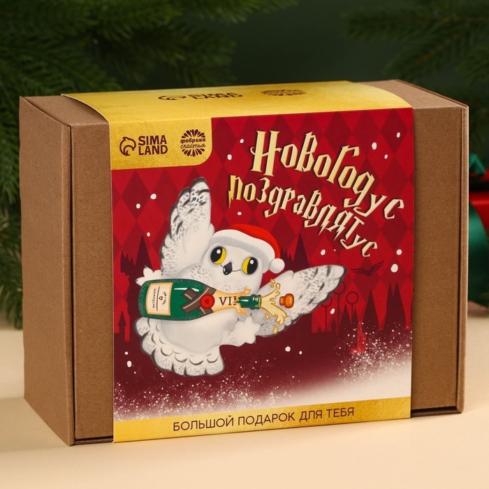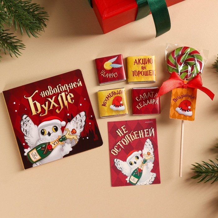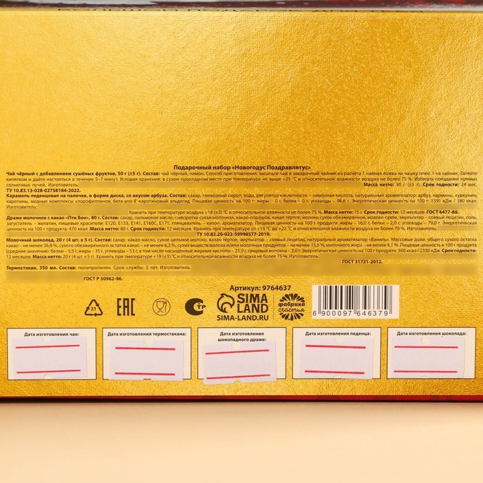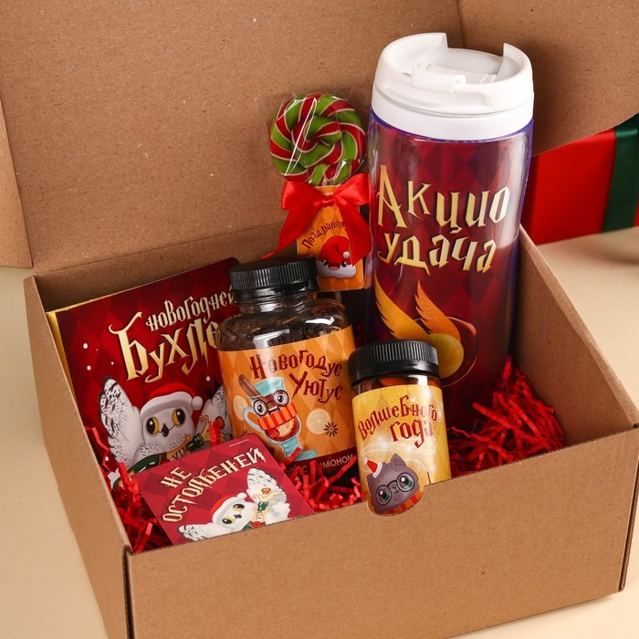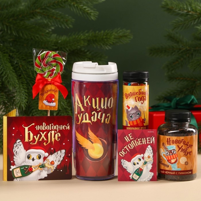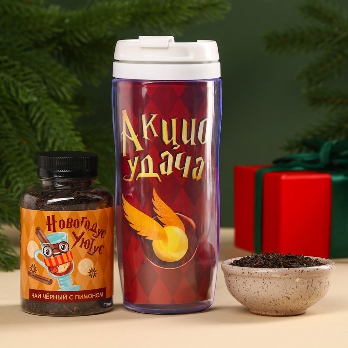 Гифтбокс «Новогодус Поздравлятус»: термостакан, чай чёрный с фруктами, леденец со вкусом арбуза, драже, молочный шоколад 4 шт.