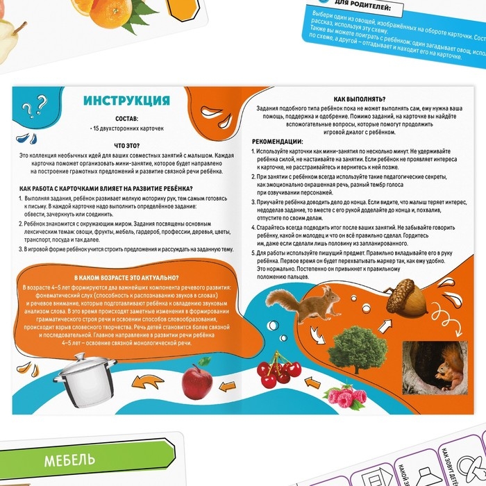 Каждая карточка поможет организовать мини-занятие, которое будет направлено на построение грамотных предложений и развитие связной речи ребёнка.