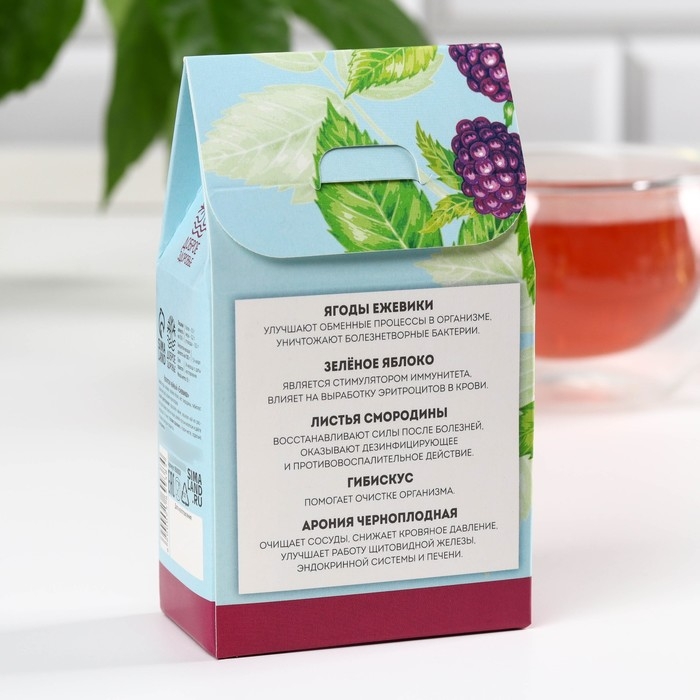 Состав: ягоды ежевики, зелёное яблоко, лист смородины, гибискус (суданкая роза), арония черноплодная.