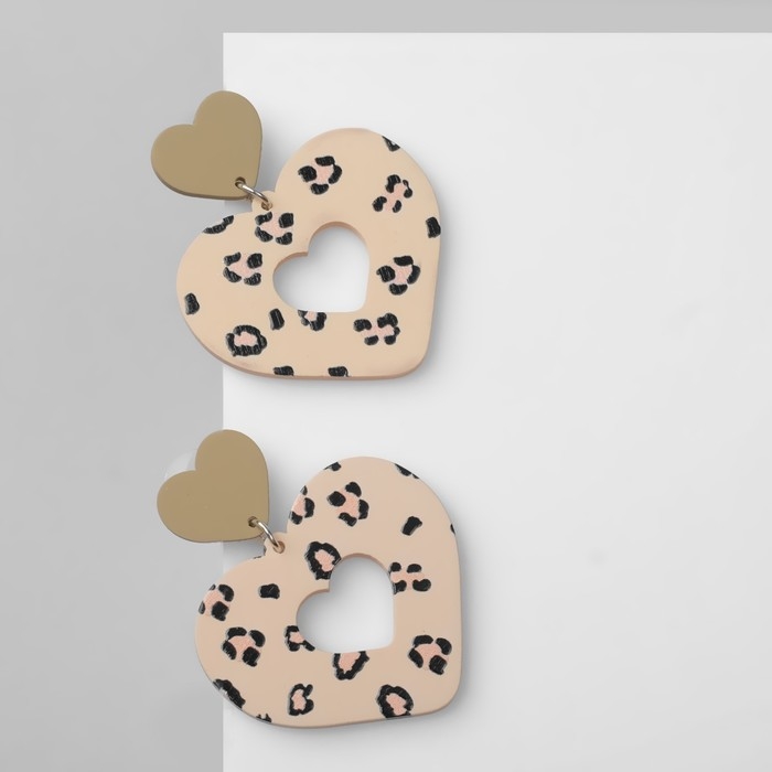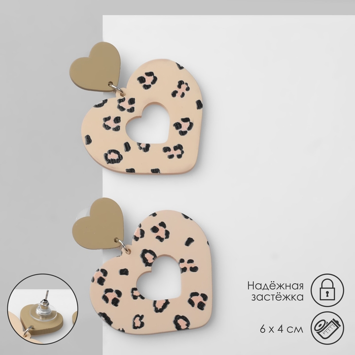 Серьги «Сердце» леопард, цвет розово-зелёный в серебре