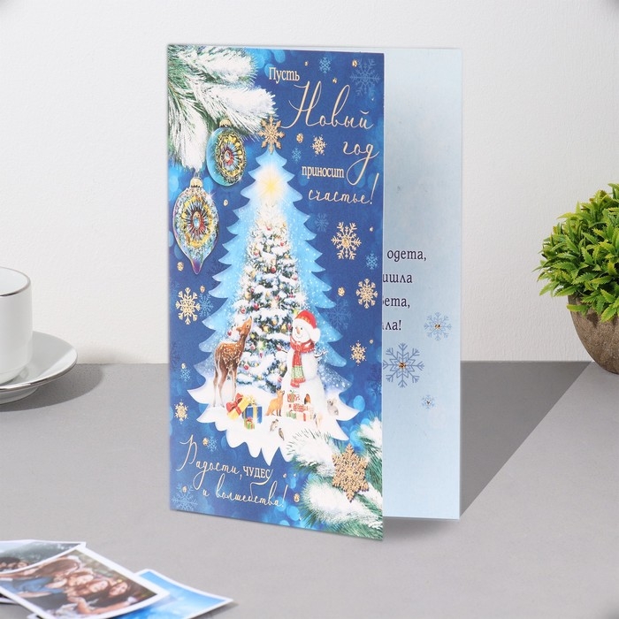Открытка "Пусть Новый Год приносит счастье!" конгрев, тиснение, снеговик, 12,5х19,5 см