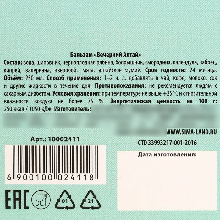 Состав: вода, шиповник, черноплодная рябина, боярышник, смородина, календула, чабрец, кипрей, валериана, зверобой, мята, алтайский мумиё.