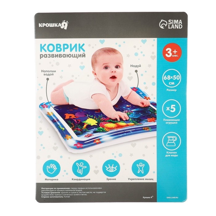 Внутри развивающего акваковрика находятся игрушки, которые будут плавать после заполнения водой резервуара. Ребёнок будет стараться достать до водных обитателей, таким образом тренируя координацию, мелкую моторику, хватательный рефлекс. А во время ползания по коврику мышцы малыша будут развиваться и усиливаться.