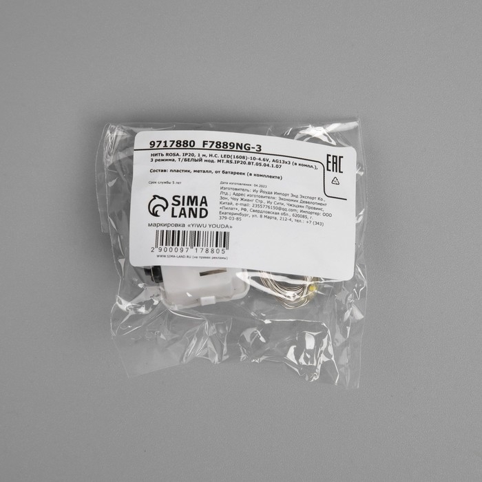 Гирлянда «Нить» 1 м роса, IP20, серебристая нить, 10 LED, 3 режима, батарейка AG13х3 (в комплекте), свечение тёплое белое