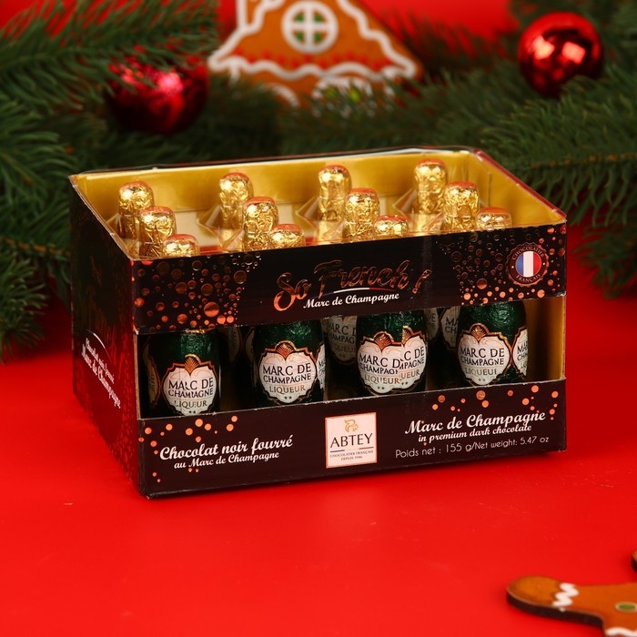 Шоколадные бутылочки из Франции станут отличным и вкусным подарком для ваших родных и близких. Попробуйте фигурки из шоколада с начинкой из шампанского Marc de Champagne; вкус которых раскрывается постепенно, где согревающее терпкое ощущение начинки перекликается с насыщенным шоколадным послевкусием.