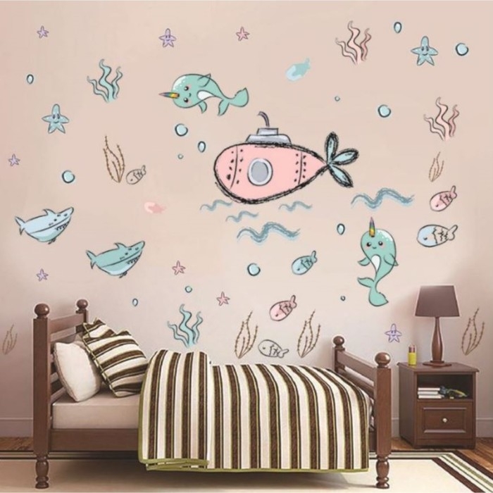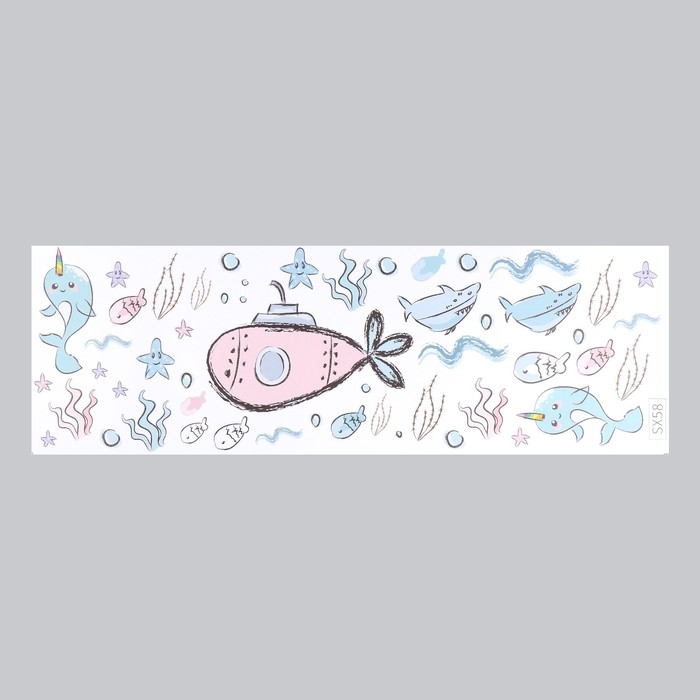 Наклейка пластик интерьерная цветная "Подводная лодка и морские жители" 30х90 см