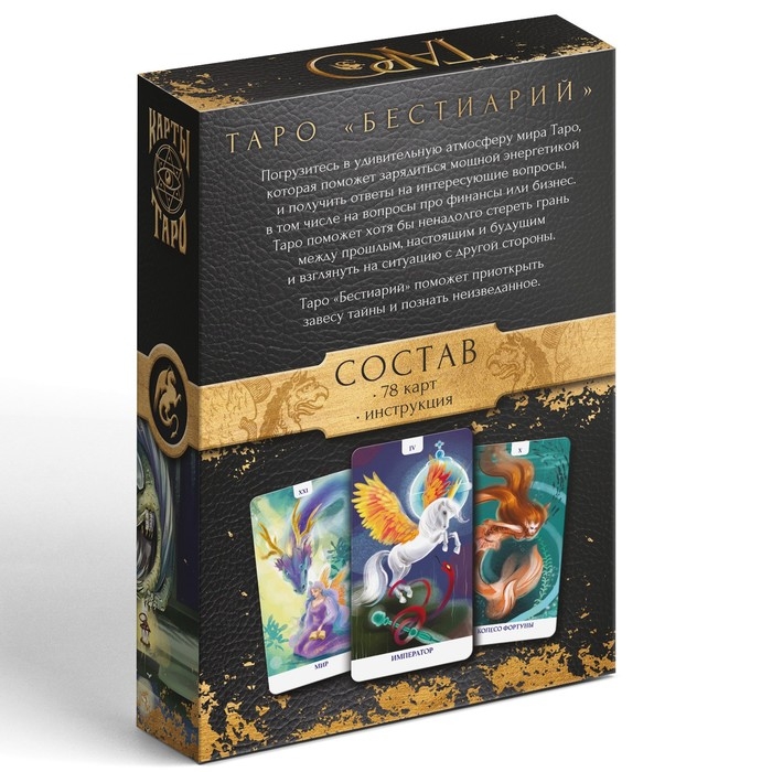 Таро – древняя и популярная карточная система, позволяющая стереть грань между прошлым, настоящим и будущим, чтобы взглянуть на проблемы с новой стороны. С их помощью вы обретете духовную гармонию и свободу, а также получите ценные советы, касающиеся желаний, болей и потребностей. Таро «Бестиарий» станет проводником в мир финансов и бизнеса, поможет увидеть путь к личному благополучию, не допустить появления ошибок или неблагоприятных ситуаций.