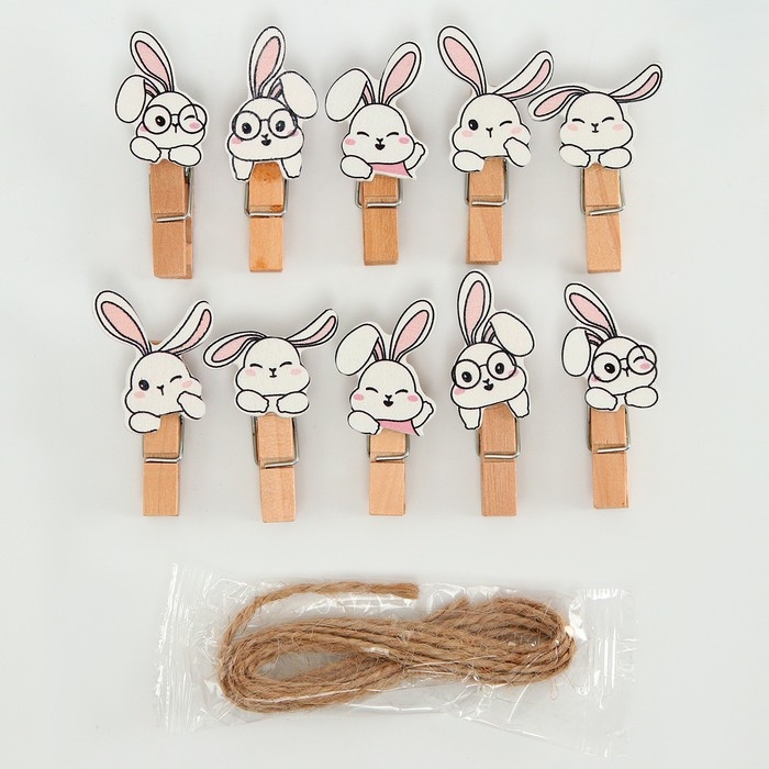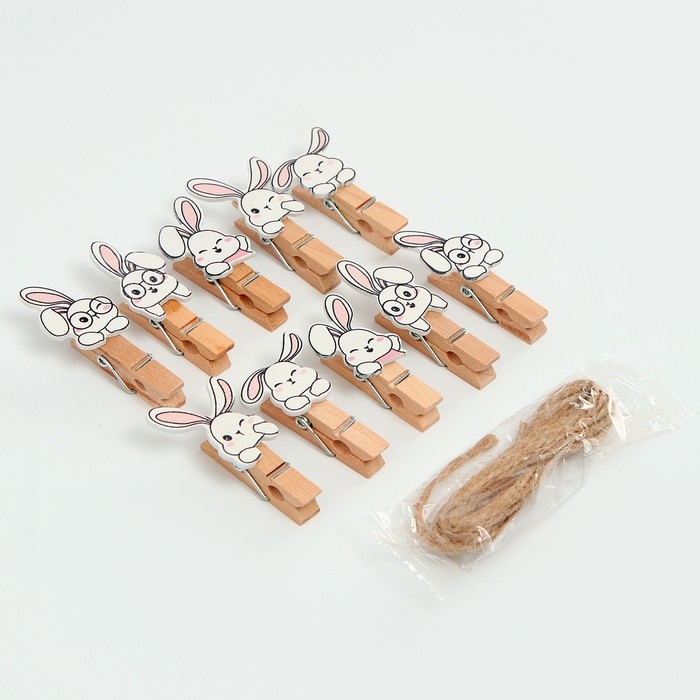 Прищепки декоративные с верёвкой для подвеса «Зайчики» набор 10 шт. — 1,5 × 12 × 14 см
