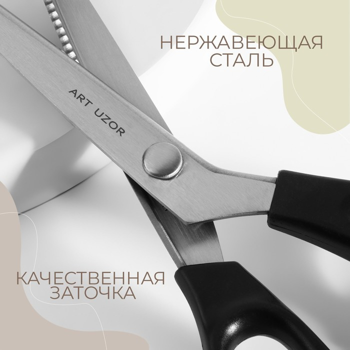Инструмент легко режет ткань, не заминая и не деформируя её, и образует аккуратный фигурный край. Ножницы изготовлены из нержавеющей стали, имеют эргономичные пластиковые ручки.
