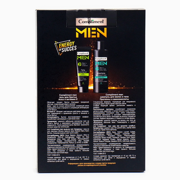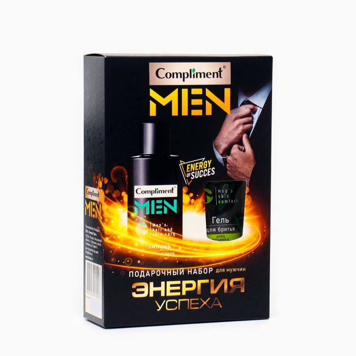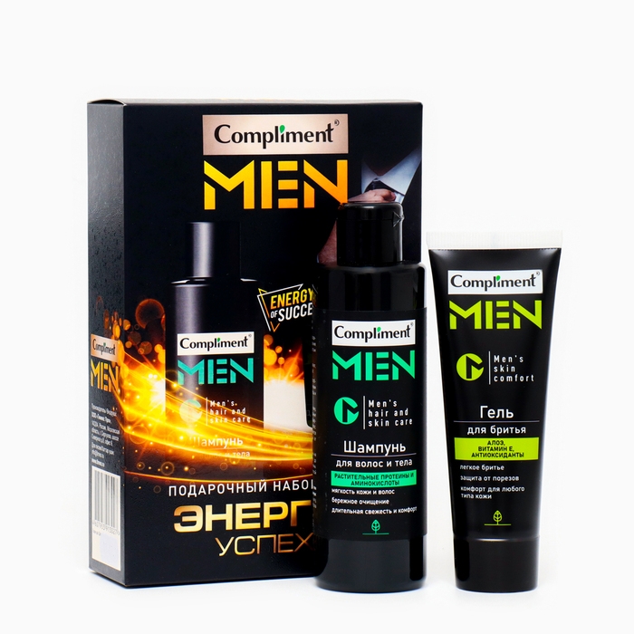 Набор подарочный мужской Men Энергия успеха: Гель для бритья, 80мл + Шампунь для волос и тела, 200мл от бренда COMPLIMENT облегчает процесс бритья благодаря прозрачной текстуре, позволяющей видеть волоски. Алоэ - один из лучших увлажнителей, снижающий риски повреждения кожи в процессе и ускоряющий регенерацию после бритья. Витамин Е обладает смягчающим действием, минимизирует повреждения и проявления сухости в процессе и после бритья. Антиоксиданты быстро восстанавливают комфорт, способствуют регенерации и смягчению кожи.