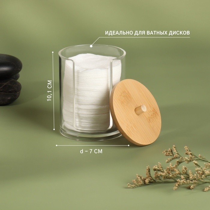 Органайзер для ватных дисков «BAMBOO», с крышкой, 7 × 7 × 10,1 см, цвет прозрачный/коричневый