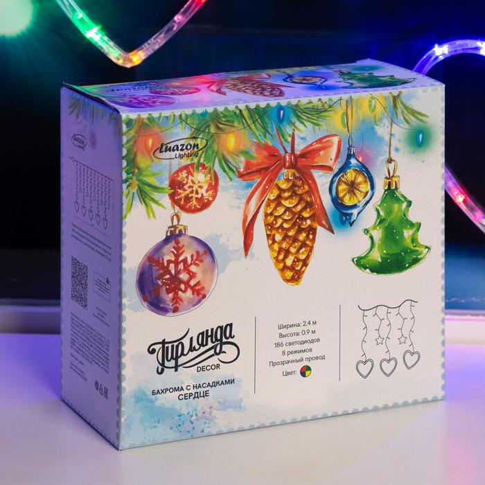 Гирлянда «Бахрома» 2.4 × 0.9 м с насадками «Сердце», IP20, прозрачная нить, 186 LED, свечение мульти, 8 режимов, 220 В