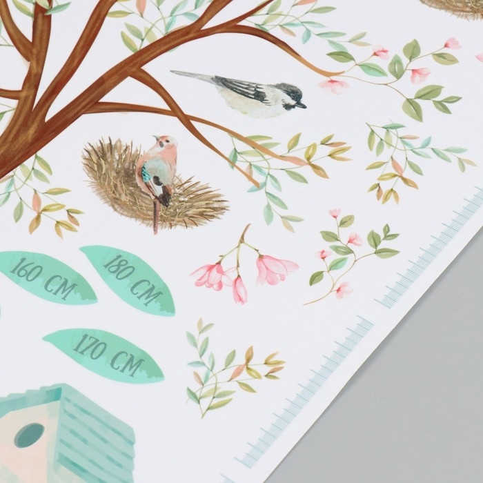 Наклейка интерьерная цветная ростомер "Птицы в гнёздах на дереве" 50х70 см