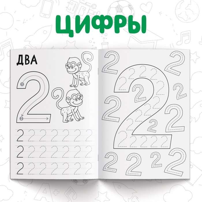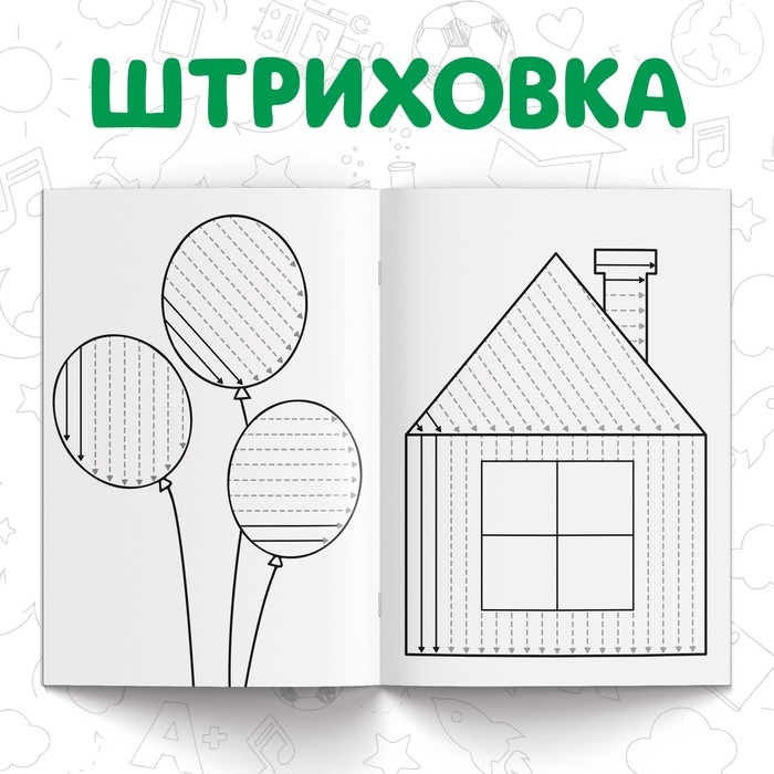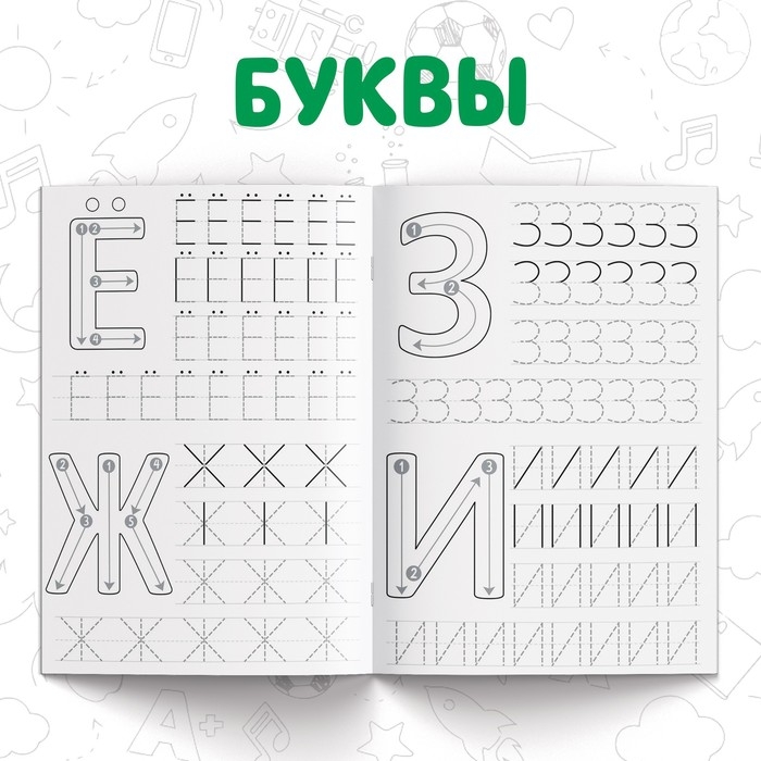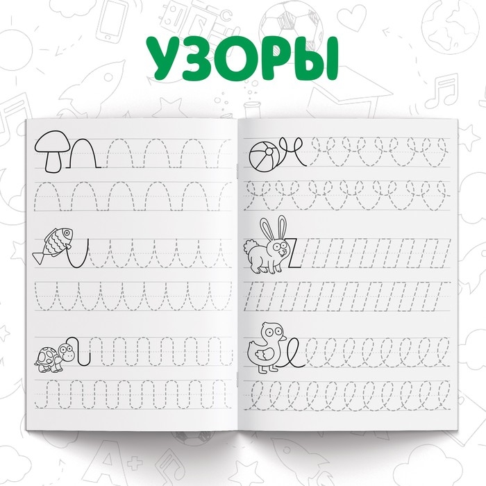 - На страничках книг малыш найдёт буквы, цифры, узоры и штриховку, которые ему предстоит повторить.