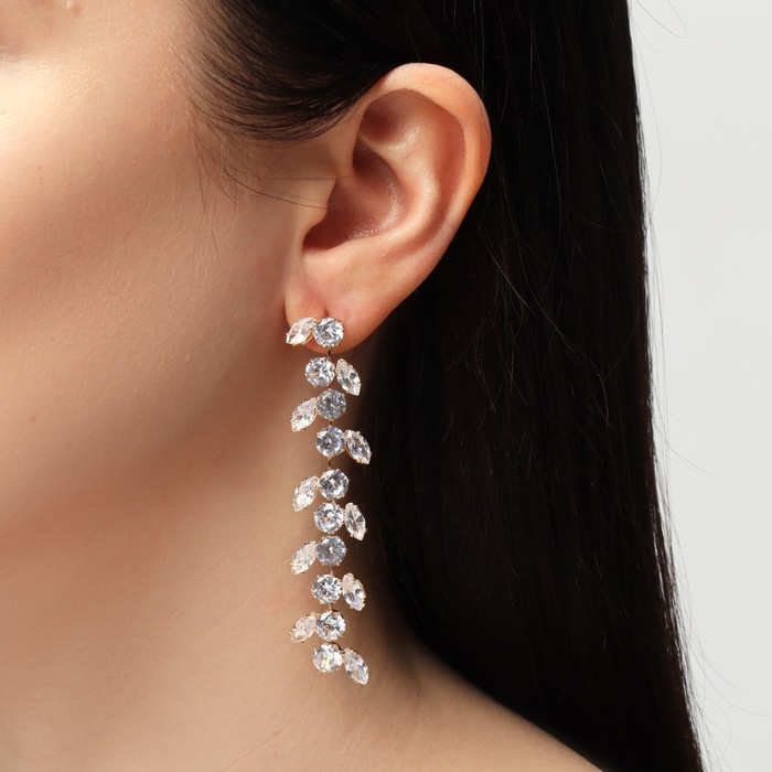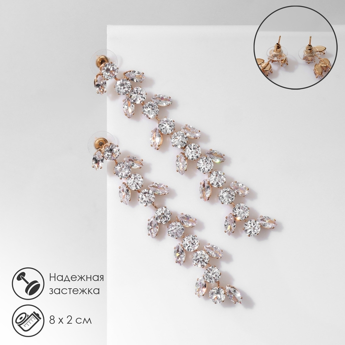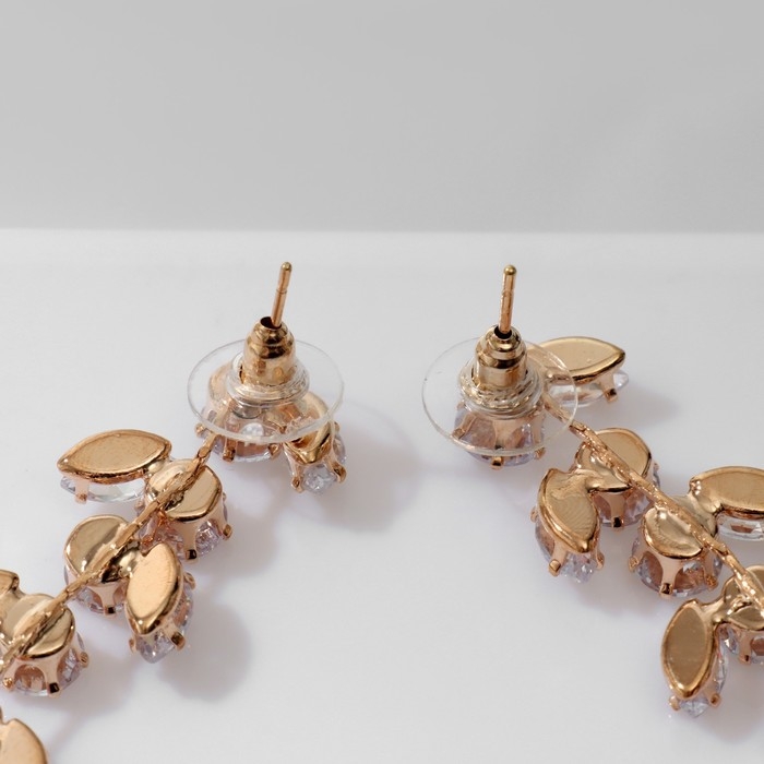 Серьги висячие со стразами «Гроздь» с листьями, цвет белый в золоте, 8 см