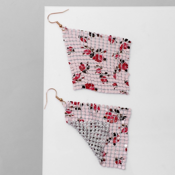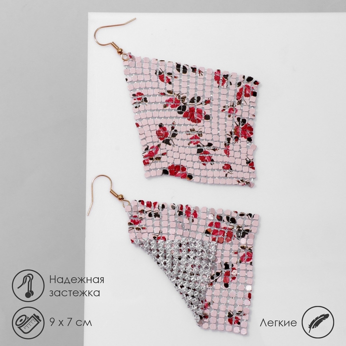 Серьги висячие «Ромб» кольчуга, цветы розы, цвет красно-розовый, 9 см