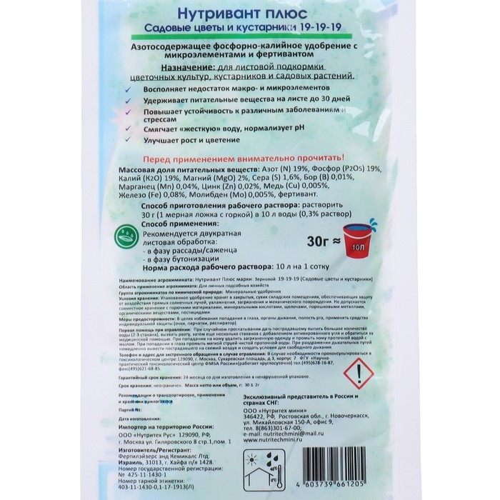 Удобрение Нутривант Плюс Садовые цветы и кустарники 19-19-19, 30 г